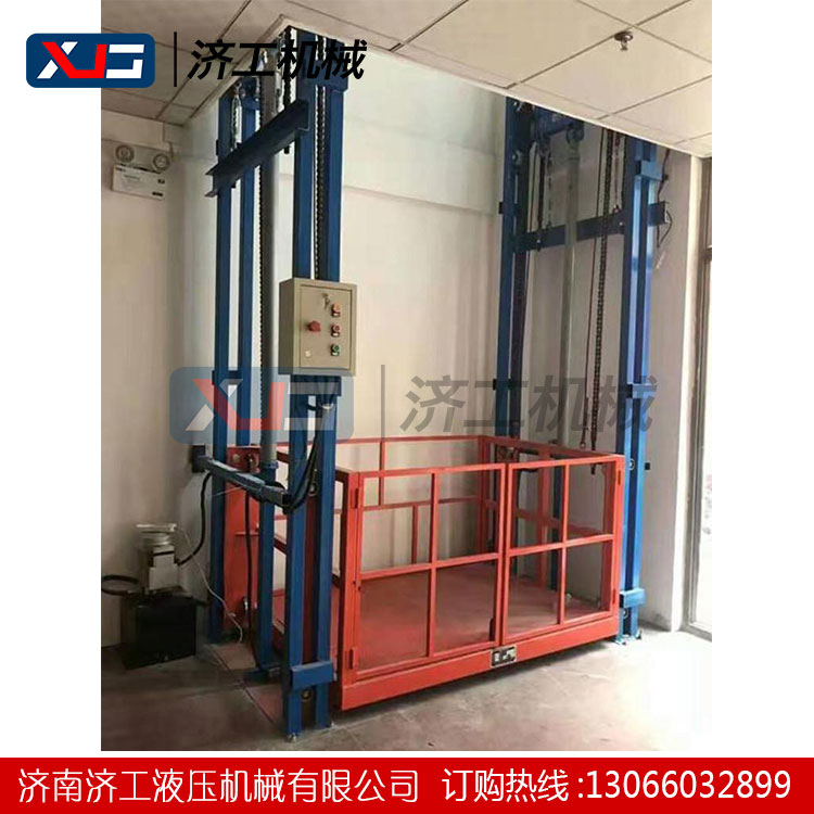 濟工導軌式油壓升降臺安裝現場,可根據客戶要求加裝不繡鋼轎廂,加裝電動卷簾門或者電梯門